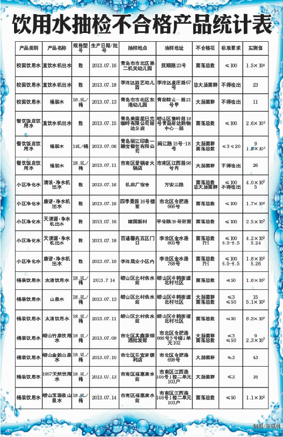 “桶裝飲用水抽檢24批次,涉及青龍、娃哈哈、塘子觀、冰露、嶗井、青啤、仰口、嶗山、至純、太清、嶗竹、嶗山金韻、九水·明漪、嶗山玉源泉等14個(gè)商標(biāo)品牌或廠家,采樣地點(diǎn)主要來自于市南、市北、李滄、嶗山等地供水站?!笔惺嘲厕k應(yīng)急管理處處長(zhǎng)匡雷說,根據(jù)產(chǎn)品類別不同,分別依據(jù)《GB19298-2003瓶(桶)裝飲用水衛(wèi)生標(biāo)準(zhǔn)》、《GB8537-2008飲用天然礦泉水》和《GB17323-1998瓶裝飲用純凈水》三個(gè)標(biāo)準(zhǔn),檢驗(yàn)項(xiàng)目設(shè)定了大腸菌群 、菌落總數(shù)、霉菌、酵母、三氯甲烷、溴酸鹽、總砷、銅、鎘、鉛共10余個(gè)項(xiàng)目,其中合格17批次,不合格7批次,合格率為70.83%。不合格產(chǎn)品中 5個(gè)批次菌落總數(shù)超標(biāo),4個(gè)批次大腸菌群超標(biāo)。