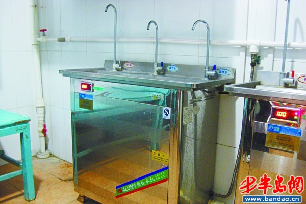 12日下午,記者來到撫順路23號(hào)的市北區(qū)第二機(jī)關(guān)幼兒園。在工作人員的帶領(lǐng)下,記者看到了幼兒園內(nèi)的兩臺(tái)直飲水機(jī)。這是兩臺(tái)艾能節(jié)能飲水機(jī),它以自來水為原水,進(jìn)水口和一旁的自來水管相連接,水通過過濾、加熱,然后就能飲用了。據(jù)介紹,每周一和周五,幼兒園都會(huì)定期用清潔劑和熱水對(duì)飲水機(jī)消毒,兩臺(tái)機(jī)器看上去都很干凈。