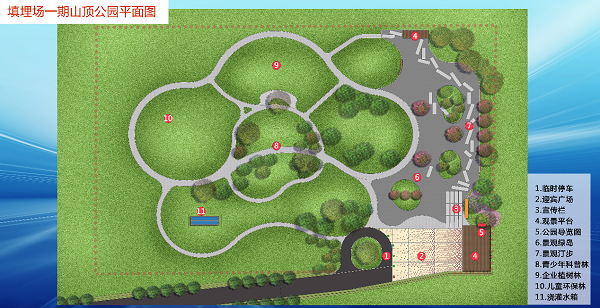 山頂公園采用耐冬花作為提取元素,通過形態(tài)演繹,利用類似花瓣的形態(tài)園路將整個公園打造成一朵盛開的花朵。園內(nèi)建設(shè)突出環(huán)保生態(tài)主題,利用舊輪胎花壇、廢舊預(yù)制板鋪裝、廢棄建材填充座椅、枯木雕塑等廢物再利用景觀元素,打造了以環(huán)保主題的廣場;綠化回填土采用廚余廢棄物和枯枝落葉處理后產(chǎn)生的有機肥料;綠化澆灌系統(tǒng)采用園區(qū)滲瀝液處理后中水澆灌,有效節(jié)約水資源。